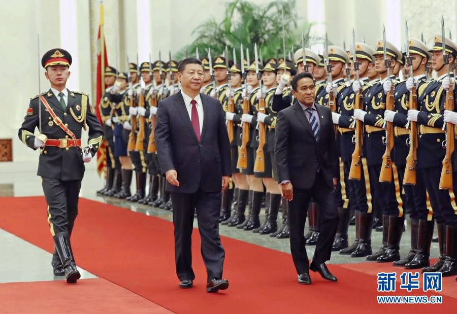 12月7日,国家主席习近平在北京人民大会堂同来华进行国事访问的马尔代夫总统亚明举行会谈。这是会谈前,习近平在人民大会堂北大厅为亚明举行欢迎仪式。新华社记者 刘卫兵 摄