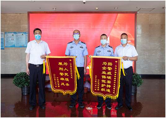 培训中心主任孔德明代表星空体育(中国)官方版网站登录入口-星空 SPORTS向怀柔分局雁栖经济开发区派出所所长和怀柔分局刑侦支队支队长送上锦旗,代表公司感谢人民警察服务企业生产建设、守护一方平安付出的艰辛努力,感谢怀柔分局雁栖开发区派出所和怀柔分局刑侦支队急企业所急、想人民所想,在企业遇到困难时及时出警,有力保障了企业财产安全,维护了社会良好秩序,为企业发展创造了平安和谐的营商环境。